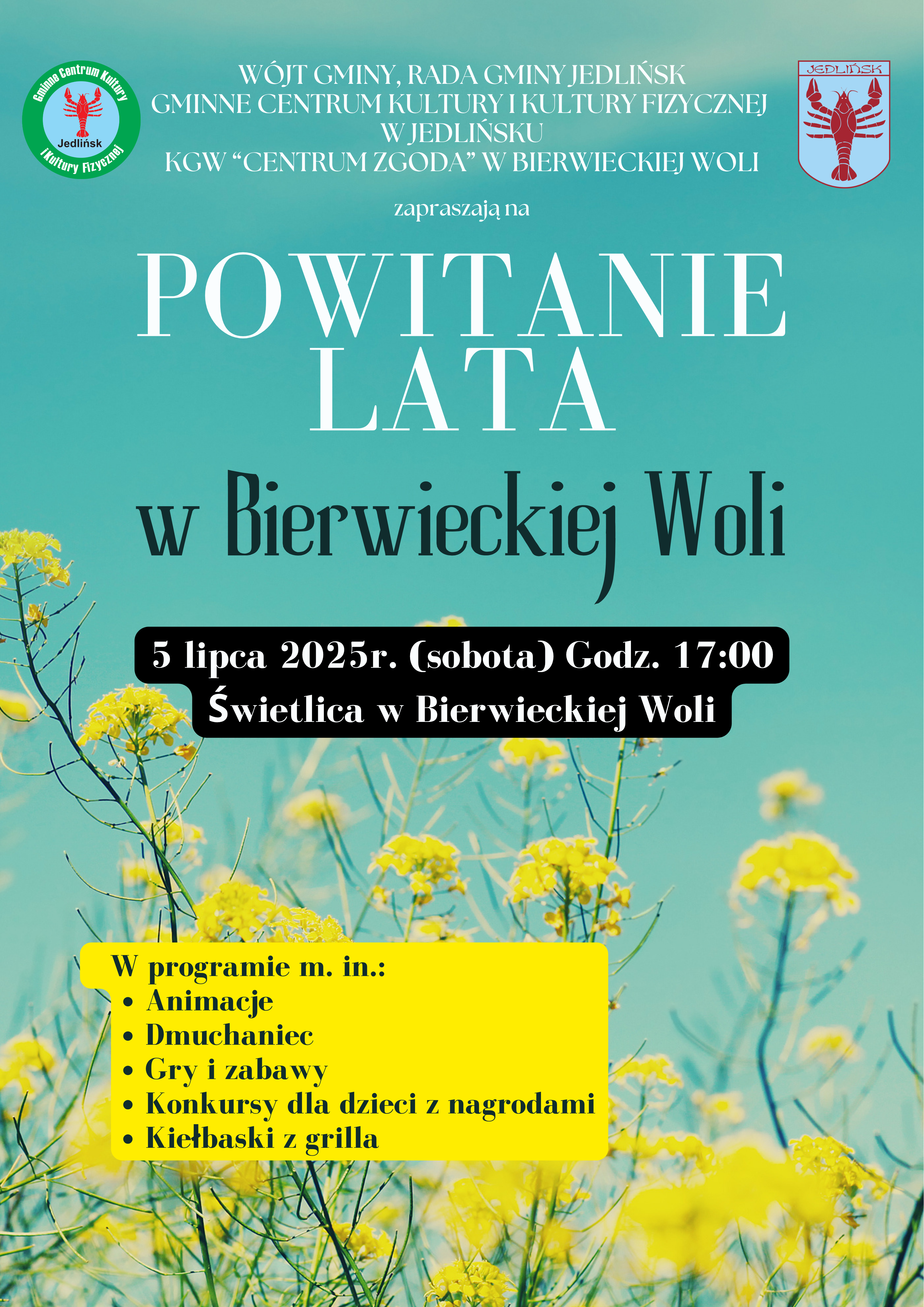 Już 5 lipca 2025 roku na terenie Świetlicy w Bierwieckiej Woli będzie miało miejsce wydarzenie pn. ,,Powitanie lata", na które zapraszają Wójt Gminy i Rada Gminy Jedlińsk, Gminne Centrum Kultury i Kultury Fizycznej w Jedlińsku oraz Koło Gospodyń Wiejskich "Centrum Zgoda" w Bierwieckiej Woli 🌞🌞🌞