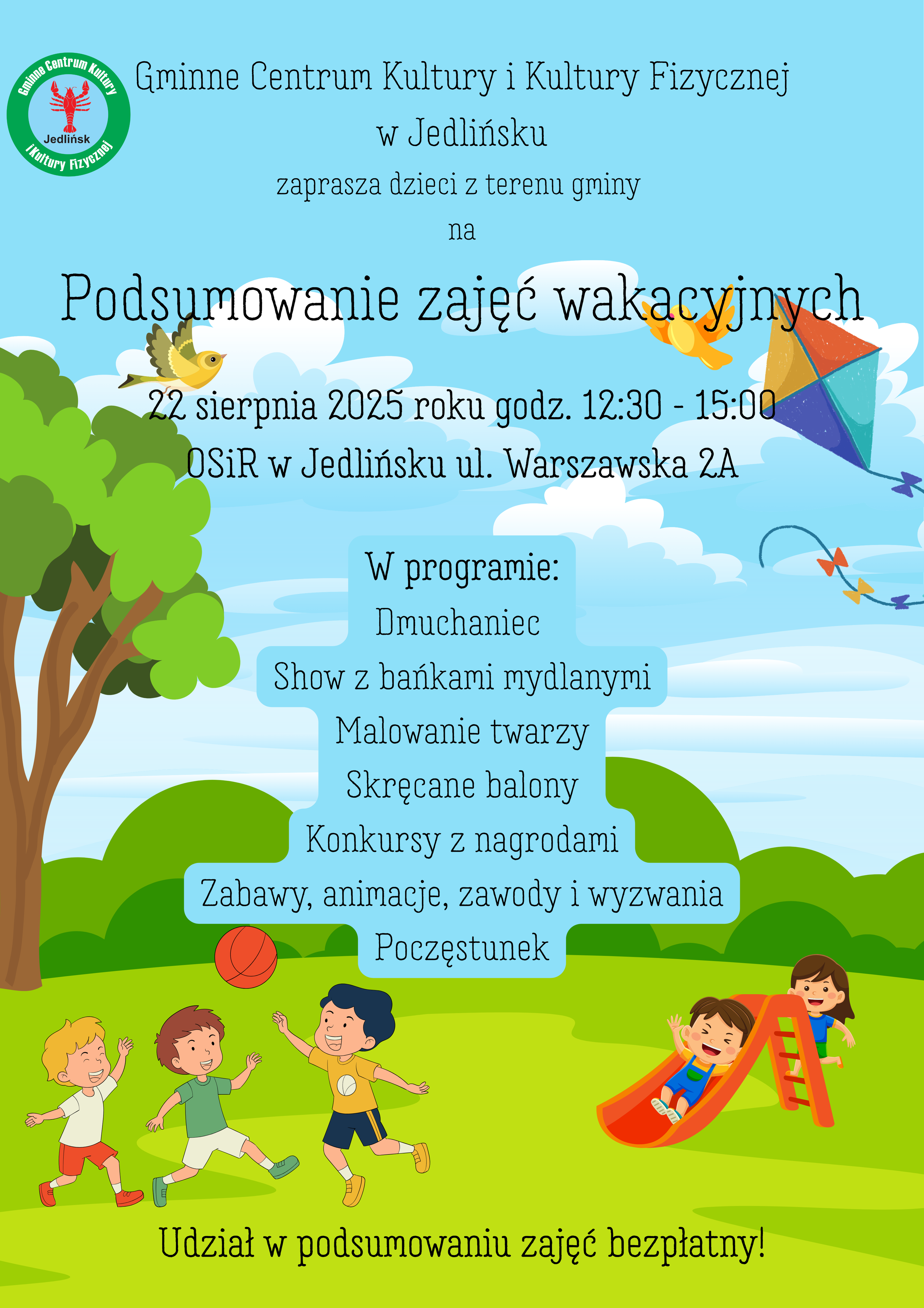 🔜Wielkie podsumowanie zajęć wakacyjnych prowadzonych w Gminnym Centrum Kultury i Kultury Fizycznej w Jedlińsku już 22 sierpnia 2025 roku (piątek) ❗️