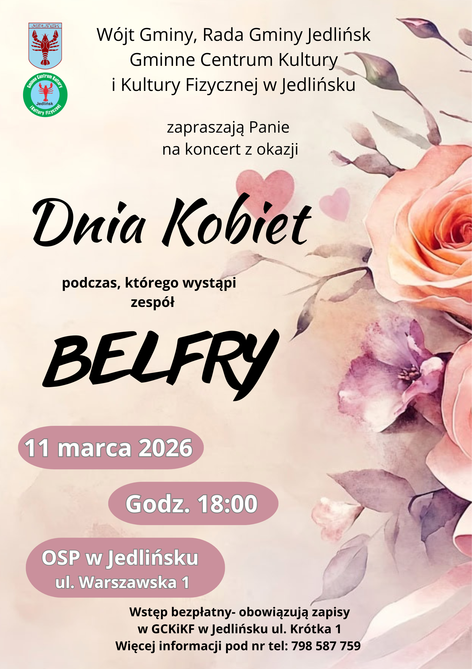 Wój Gminy, Rada Gminy Jedlińsk i Gminne Centrum Kultury i Kultury Fizycznej w Jedlińsku zapraszają Panie na koncert z okazji Dnia Kobiet, podczas którego wystąpi Zespół Belfy. Koncert odbędzie się 11 marca 2026 w sali OSP w Jedlińsku. Zachęcamy do zapisów.