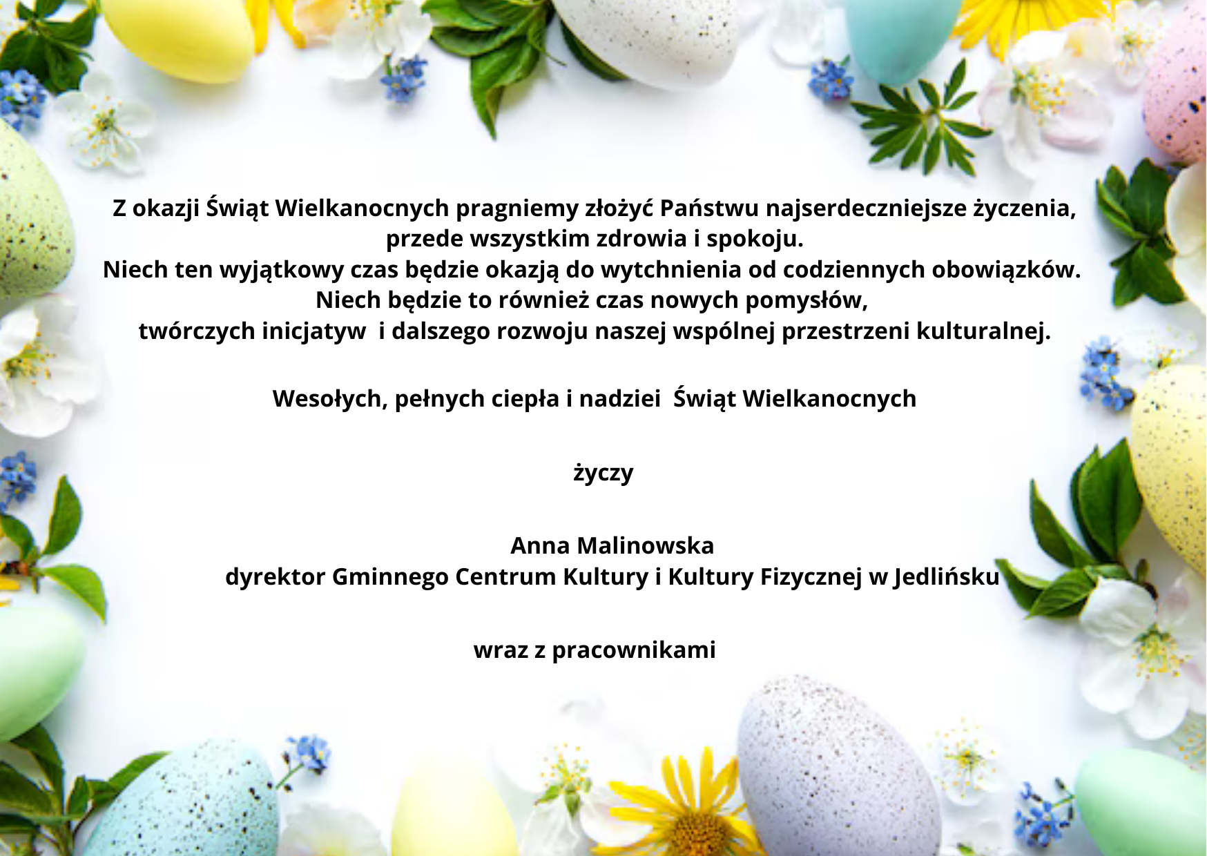 Dyrektor Gminnego Centrum Kultury i Kultury Fizycznej Anna Malinowska wraz z pracownikami pragnie złożyć najserdeczniejsze życzenia z okazji Świąt Wielkanocnych.